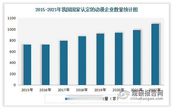 企业数量是反映动漫产业竞争格局和活力的重要指标。近年随着我国动漫产业的发展,政府政策的扶持,越来越多的企业投入到动漫文化产业中来。根据根据国家文化和旅游部数据显示,2022年我国国家认定动漫企业数量达到1100家左右,同比增长10%,创下2010年以来的最高增速。其中动画创作、制作企业数量为450家,增长15.4%;其他类型企业数量为650家,增长6.6%。