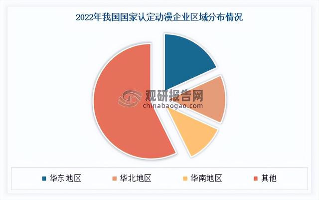 从区域分布看,华东地区认定动漫企业数量最多。数据显示,2022年我国华东地区认定动漫企业数量有200家,占比达18.2%;其次是华北和华南地区,企业数量分别为150家和120家,占比分别达13.6%和10.9%。
